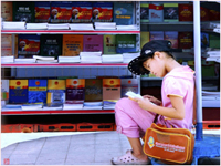 Em bé say sưa “đọc sách ké” trong Hội chợ sách ở Tp Cần Thơ (tháng 3/2015). Ảnh: Triệu Vinh