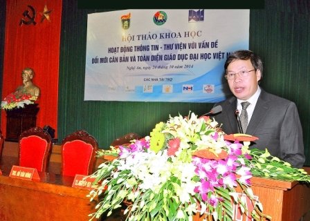Phát biểu khai mạc Hội thảo, PGS.TS.NGƯT. Đinh Xuân Khoa, Ủy viên Ban Chấp hành Đảng bộ tỉnh Nghệ An, Bí thư Đảng ủy, Hiệu trưởng Trường Đại học Vinh đã khẳng định: “Hoạt động giáo dục đại học luôn gắn liền với hoạt động chuyển giao tri thức và nghiên cứu khoa học. Một trong những yếu tố quan trọng và đóng vai trò quyết định chất lượng chuyển giao tri thức là khả năng cung cấp nguồn thông tin khoa học của các thư viện đại học để phục vụ tốt hoạt động đào tạo, nghiên cứu khoa học. Vì vậy, đổi mới giáo dục đòi hỏi các thư viện cũng phải đổi mới”. Trên cơ sở đó, Phó Giáo sư đã đánh giá cao việc Ban tổ chức chọn chủ đề: “Hoạt động thông tin – thư viện với vấn đề đổi mới căn bản, toàn diện giáo dục đại học Việt Nam” để tổ chức Hội thảo. Đây là hoạt động khoa học thiết thực, thể hiện rõ trách nhiệm, mong muốn đóng góp trí tuệ, công sức, góp phần triển khai mạnh mẽ chương trình hành động thực hiện Nghị quyết số 29/NQ/TW của Ban Chấp hành Trung ương Đảng khóa XI về “Đổi mới căn bản, toàn diện giáo dục và đào tạo, đáp ứng yêu cầu công nghiệp hóa, hiện đại hóa trong điều kiện kinh tế thị trường định hướng xã hội chủ nghĩa và hội nhập quốc tế”.