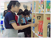 Các thi sinh tham gia cuộc thi thử tài tìm sách trong thư viện để đọc & sáng tạo