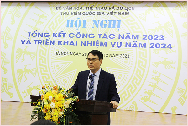 Chiều ngày 26/12/2023, Thư viện Quốc gia Việt Nam (TVQG) tổ chức Hội nghị Tổng kết công tác năm 2023 và triển khai nhiệm vụ năm 2024. Được sự quan tâm, chỉ đạo của Lãnh đạo Bộ VHTTDL, TVQG đã tập trung nhân lực triển khai đồng bộ các nội dung công tác chuyên môn và phục vụ bạn đọc, đẩy mạnh thi đua với chủ đề “Đoàn kết, kỷ cương, hành động, sáng tạo, phát triển”. Bên cạnh thực hiện tốt các nhiệm vụ cam kết với Lãnh đạo Bộ, các mảng công tác chuyên môn của Thư viện được đảm bảo, nhiều khâu công tác vượt chỉ tiêu, định mức so với kế hoạch đầu năm. Hãy cùng nhìn lại những kết quả mà TVQG đạt được trong năm 2023 thông qua Video tư liệu sau: